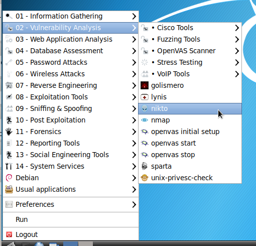 If you already have Kali Linux, you'll find that nikto is already installed under the Vulnerability Analysis menu: