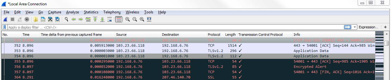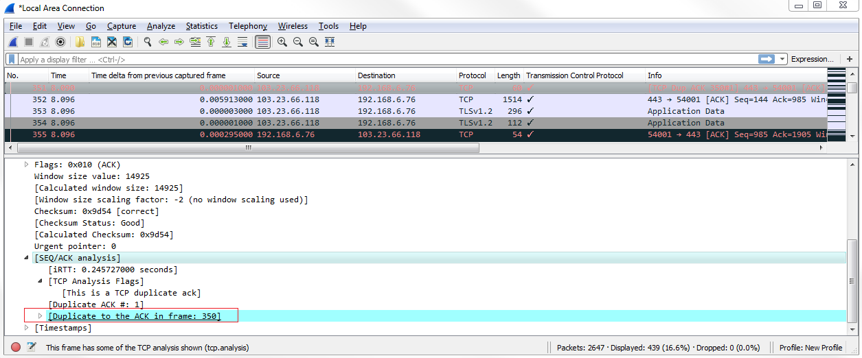 Now, we can see all of our TCP analysis issues. So what we can do is, click on that packet and validate this, as well. If we click on one of these black packets, expand TCP, and then look at the analysis section, it tells us that there's a duplicate. This is a duplicate to a previous acknowledgment, which is obviously a problem that's indicative of an issue: