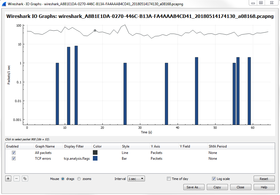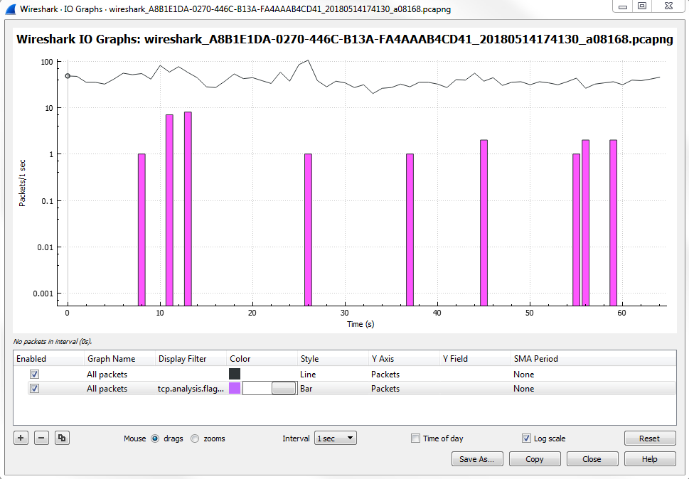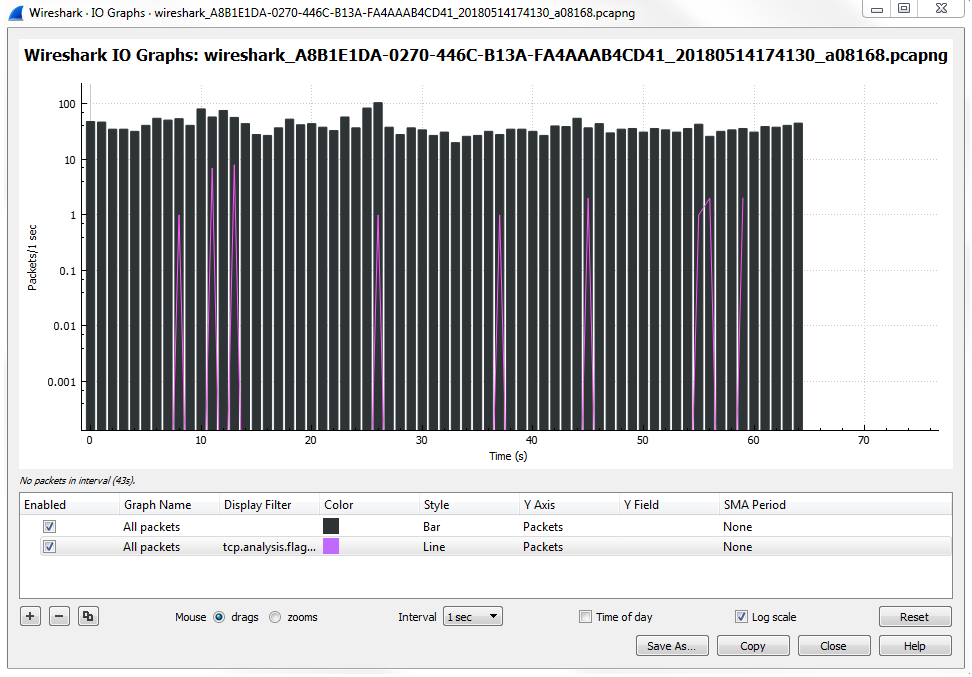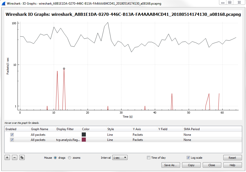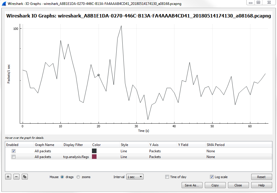 The I/O graph is a very powerful feature in Wireshark, and here it's showing us all the packets per second, and all of this is customizable. You can change the Interval and you can also change whether it's a linear or logarithmic scale: