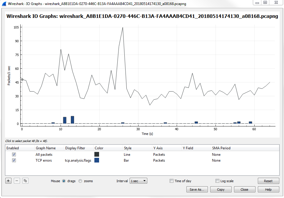 When we apply this, it will create a second layer on the graph with a red line graph of any packet that has an analysis done to the flags. Wireshark looked into the flags and saw that something occurred and it provided some sort of insight into it. Just like we saw with the expert information in the lower left, this display filter uses the same functionality as the expert information.