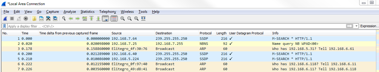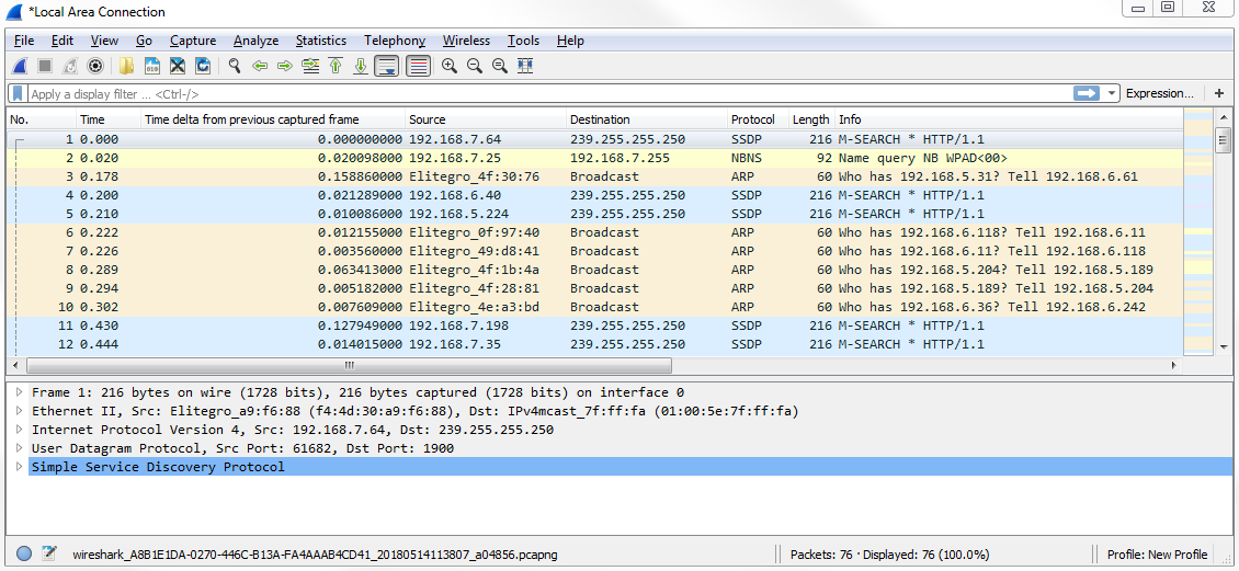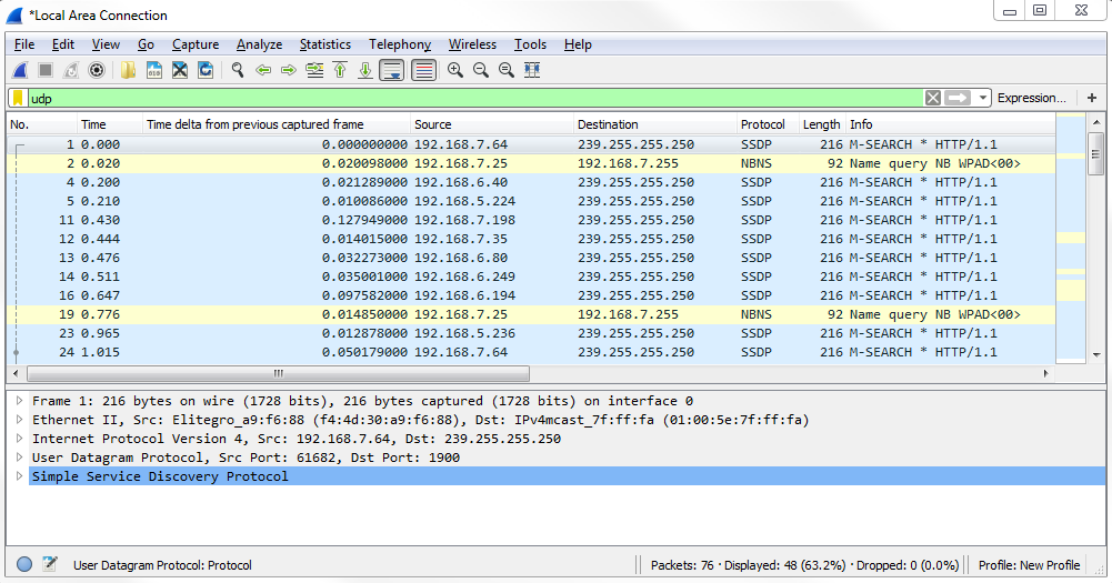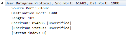 And you can see that we have some additional protocols listed, which include applications that use UDP for their transfer, such as SSDP. What we can do in the packet details is take a look at the UDP section: