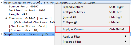 One thing you can do if you're not sure whether a packet is UDP or not when looking through the packet list up top is create a column based on UDP. So we right-click on User Datagram Protocol, Src Port: 40097, Dst Port: 1900 and select Apply as Column: