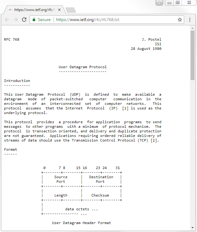 This is the original specification. It's been updated since August 28, 1980, if you look through all of the RFCs, but the original specification is 768. If you'd like to learn about all the details of UDP, which are relatively short, you can do so through the file shown in the preceding screenshot.