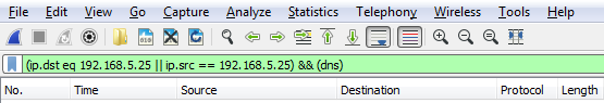 Now, we can go even farther. So we can say && ip.len <= 72. And now, I've trimmed it down to any DNS packets to and from my gateway that are less than 72 bytes in length: