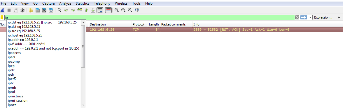 So, let's create an example using the parentheses I mentioned. So, what we'll do is filter based on my gateway again. What I'll do is quick-access one of my last used display filters. So, I'll type ip. Now, if you look there, it has the most recently used ones at the top. So, I'll use the down arrow, select the one I want to use, and press Enter:
