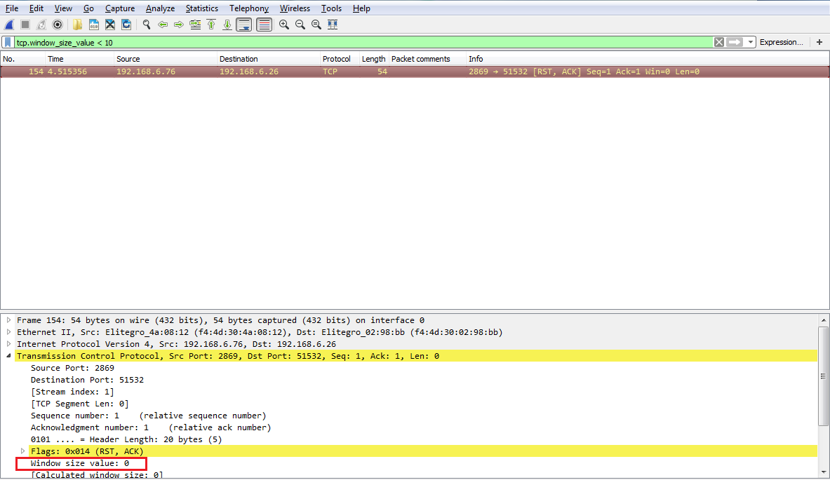 If we expand our TCP details, you'll see there's the window size; it's certainly less than 10:
