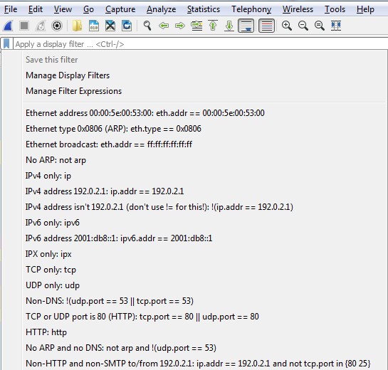So, let's get some packets to work with. I'll start a capture on my primary interface, without any capture filter entered. So we'll capture everything that's occurring on my system; currently, whatever's in the background. So, after we have a good amount of traffic to work with, you will notice that at the top we have a textbox that says Apply a display filter, and that works just like the capture filter textbox does. We can type in whatever is the display filter that we're looking for. We also have the bookmarks icon on the left, just like with the capture filters. And if I click on that, it gives me my saved filters. I can have a whole bunch of them listed, as shown in the following screenshot—these are the common ones that come prebuilt with Wireshark: