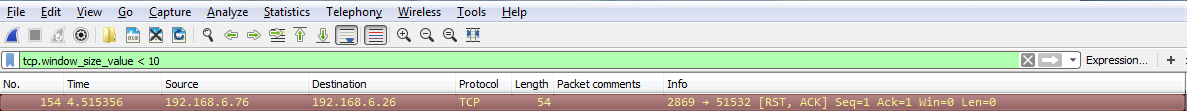 Another interesting thing we could do is, let's say we need to troubleshoot something with a slow transfer with TCP. So we want to look at the window size, so we type in tcp.window_size_value < 10. So, let me press Enter and there we go. So, we have one packet. Remember, we didn't define any sort of IP address. Any of the packets that Wireshark has captured that has a window size less than 10 will be shown to me: