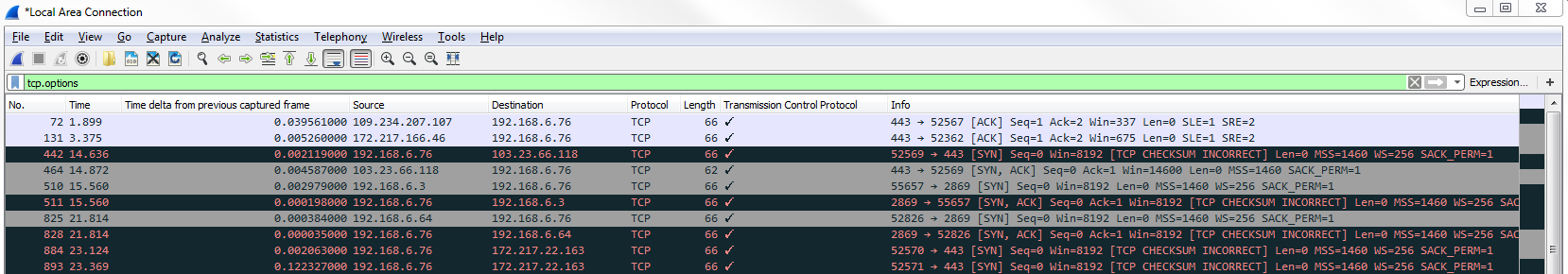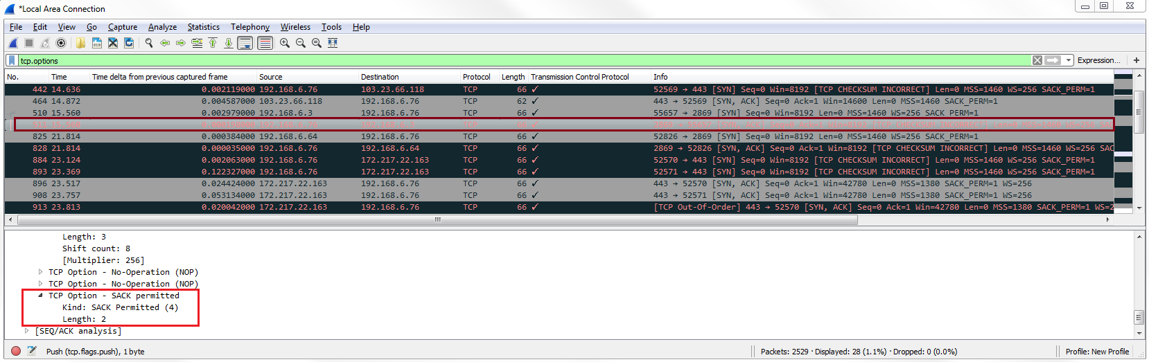 Now we're showing all the traffic that has options enabled in the header. If we scroll down in the packet details area, we have some information about the Options. We can skip the No-Operation stuff. We want to look at things that are more interesting to us, such as TCP Option - SACK permitted and TCP Option - Window scale: