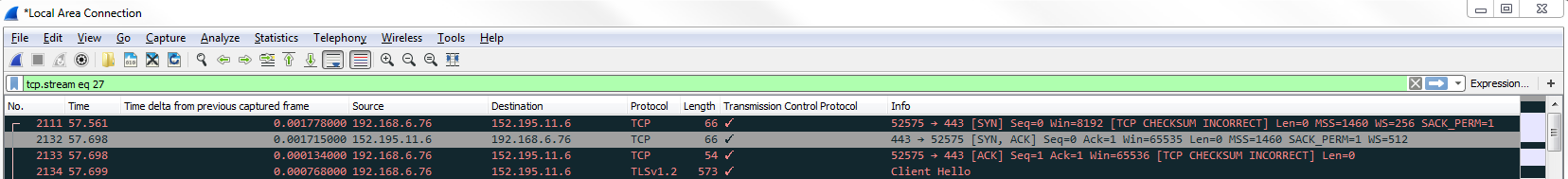 You can see that the filter for tcp.stream eq 27 is listed in the filter option. Now this is our connection to the website for IETF. As mentioned earlier, TCP is connection-oriented. It guarantees delivery of packets. So if you miss a packet, the acknowledgment system builds in and retransmits it. So what happens is that we send a piece of data from the server to the requesting device. We send an acknowledgment that we received it. We also send another packet followed by an acknowledgment indicating that we've received it.
