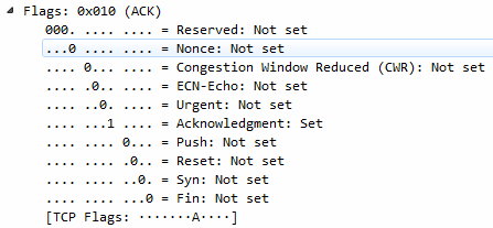 Next, we have Header Length. It tells us how big the header is because the header can change its size in TCP, unlike UDP, so we have to tell it how long it is. We have some Flags, as shown in the following screenshot: