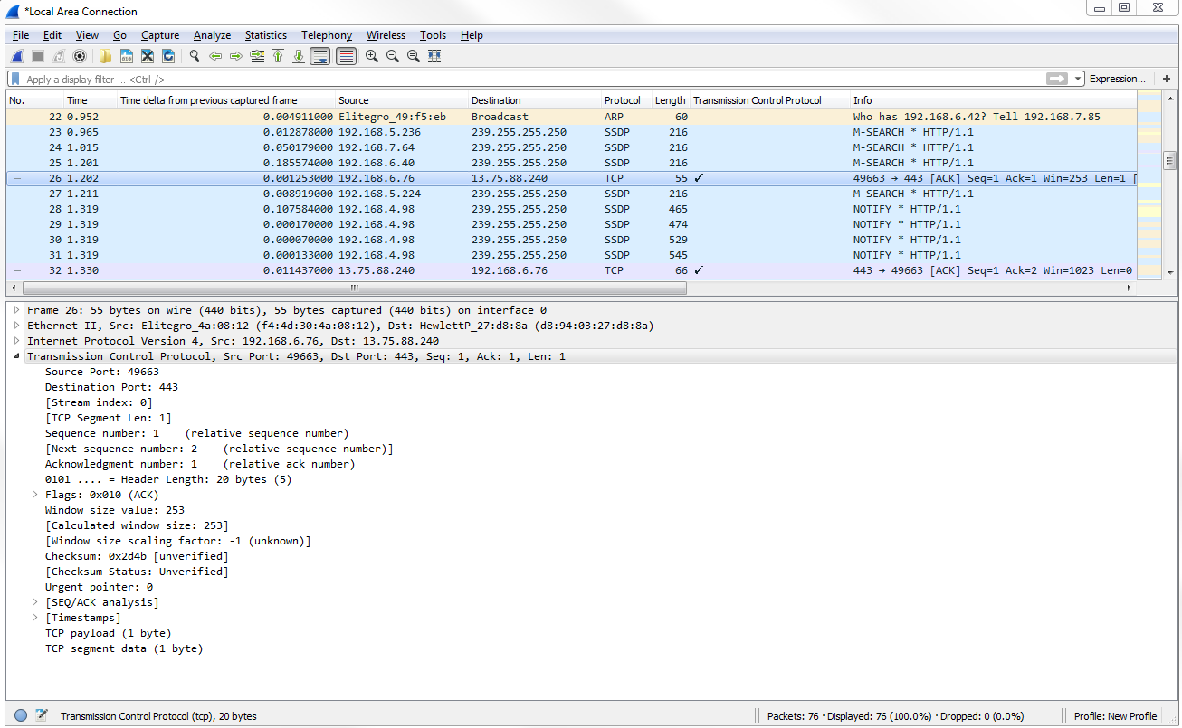 In the preceding screenshot, you can see we have some congestion information; the Urgent bit; Acknowledgment and Push; and Reset, Syn, and Fin. A lot of this stuff will look familiar, such as SYN, Acknowledgment, and FIN with creating a connection and finalizing a connection. We also have Window size value, which tells us how large of a chunk of data we can transmit before having to do an acknowledgment: