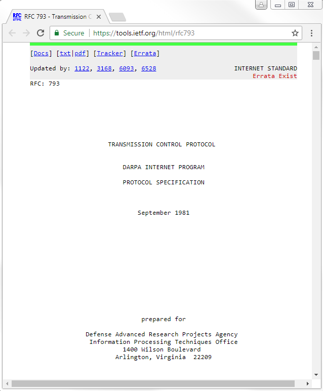 In the preceding screenshot, you can see different sections within IETF, which provide a little bit of interactivity. You can click on the different RFCs that have updated the TCP specifications; if you scroll down, it also provides you a nice little table of contents. The RFC shows a little diagram of what the TCP header looks like: