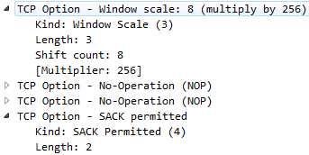 We also have window scale. Window scale, as shown in the earlier screenshot, allows us to go beyond the initial window size. The initial window size was at a maximum of 65535 bytes, which isn't a lot anymore, so we want more than that. We can do that using window scale. Window scale allows us to multiply the window size by a factor. So you could say 65535 times whatever the window scale is, for example. Then, you could get a very, very large window size in order to most efficiently use your bandwidth.