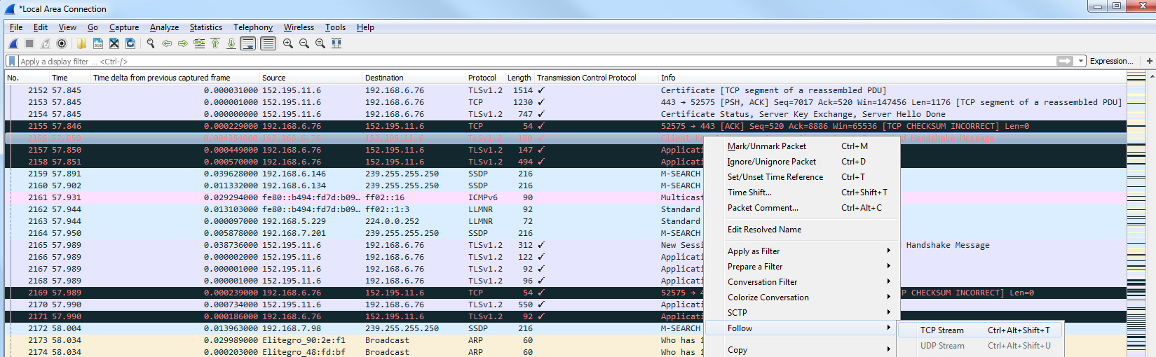 It looks like the website that's being transmitted. It was over HTTPS, so seeing the TLS traffic is what we can expect. We'll right-click on the TLS traffic and go to Follow | TCP Stream: