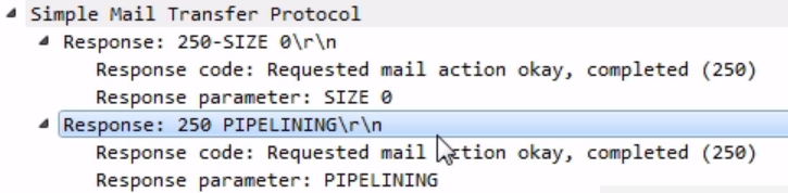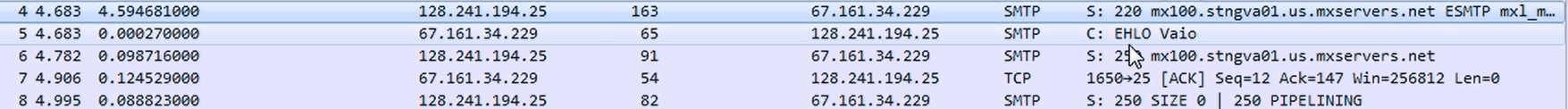 The client then sends an EHLO, which is the enhanced version of HELO for the traditional original protocol, for it to create a connection. The server responds to the HELO request and creates a connection. We then acknowledge that, and then the server responds with a listing of what it can do. There are some features that it has, and we see that it has PIPELINING: