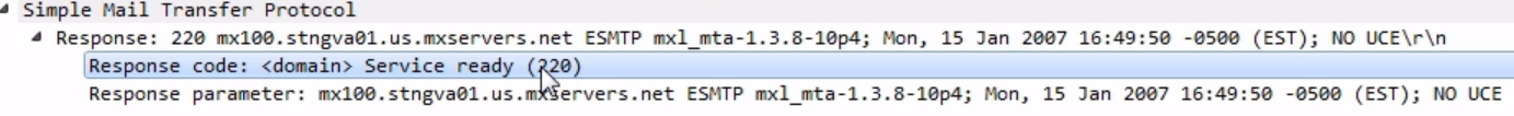 Many of these protocols, especially the ones that are older, use these different numbered response codes. Just like with the HTTP, 200 series response codes are good. So we see a 220, everything's good to go. We also see that we have ESTMP. This is for the enhanced version of SMTP. Just like with POP and FTP, SMTP is a very old protocol, and it's been extended and enhanced over the years. There's a newer version of SMTP, which is transmitted using new commands, with an E in the front:
