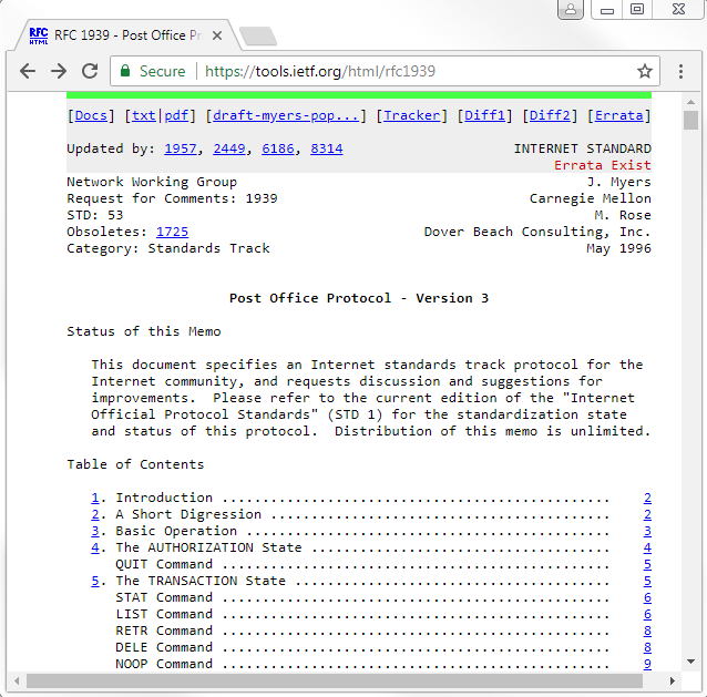 - RFC 1939 for POP, which you can see in the following screenshot (https://tools.ietf.org/html/rfc1939):