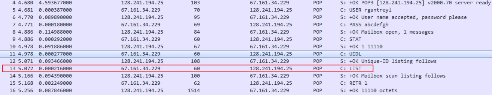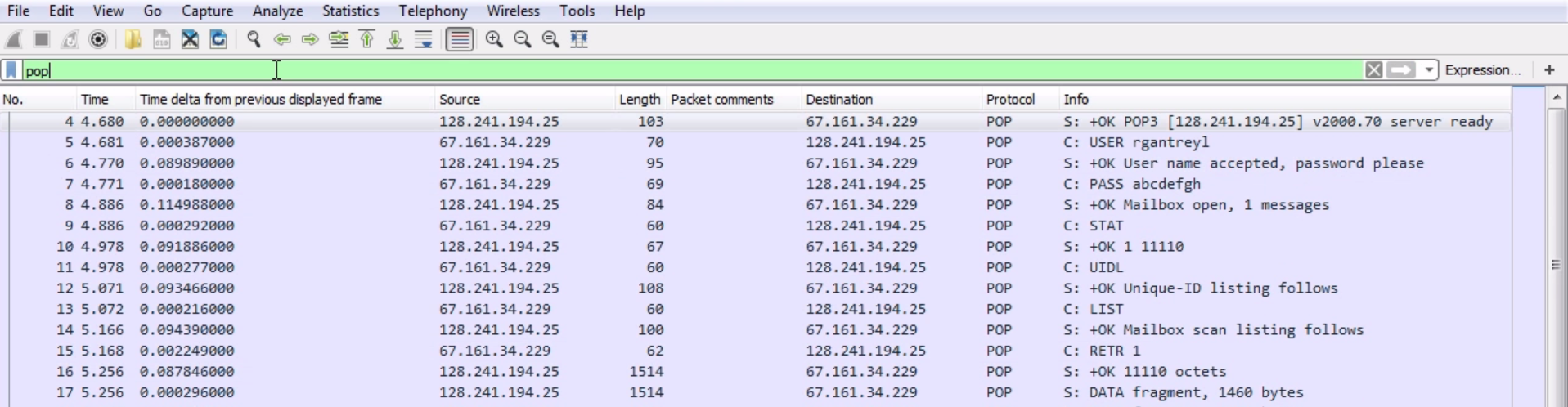 What we see in the packet capture is we have in the beginning a three-way handshake for TCP; POP is transmitted over TCP. And then we have our POP communication as well as some acknowledgments, and then the FIN closure.