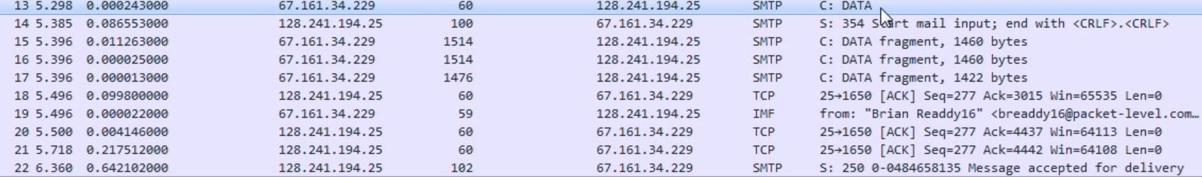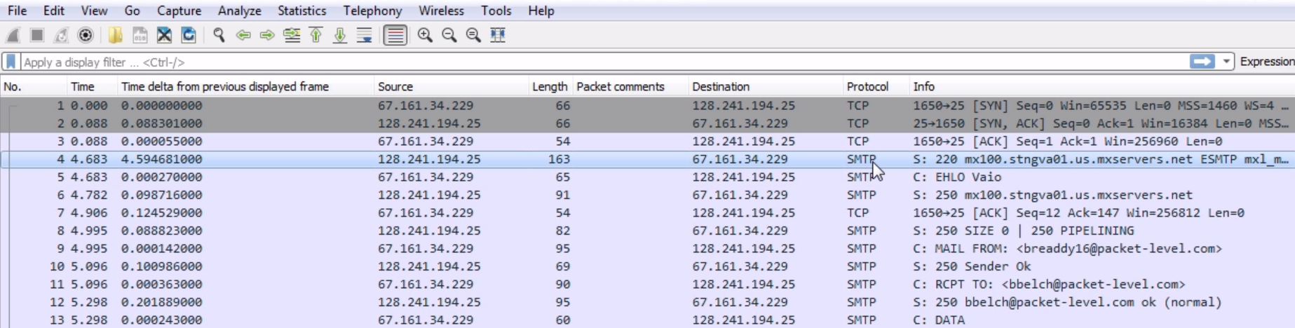 What we see here is a series of SYN and ACK of a user creating a TCP connection for SMTP, and then we see the SMTP response from the server. And of course, we have SMTP listed in the Protocol column. We could filter on that by simply typing smtp: