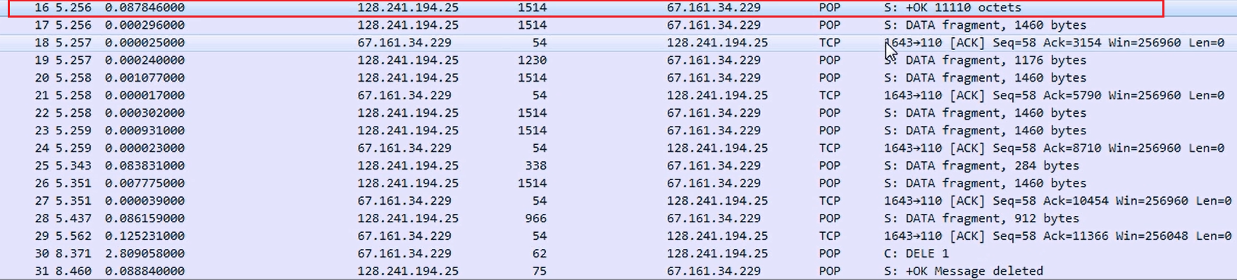 So, the first packet was basically the header information with the beginning of the data, and then the data continues. We then acknowledge the packets. We keep retrieving data, then the client says: delete the message. We have downloaded the email; now delete the message. This is an option that is changeable.