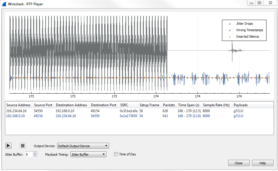 Now, you will notice that the preceding graph was real-time, and as the audio plays, you will see the playback line go across. This is a relatively clean capture. If there are any problems in the capture, they will show up on this graph, and you'll see them begin to occur as you change things such as the Jitter Buffer. So what we'll do is we'll drop that down to something very low, let's say 5:
