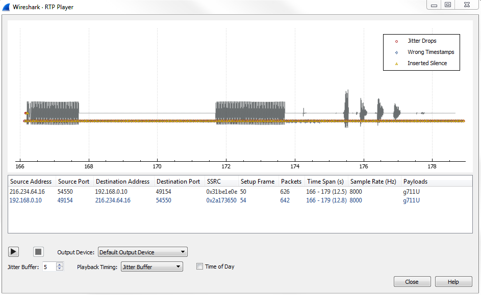 After selecting the call, click on Play Streams. And when you click on that, you'll see a histogram of exactly what's going on in the voice call: