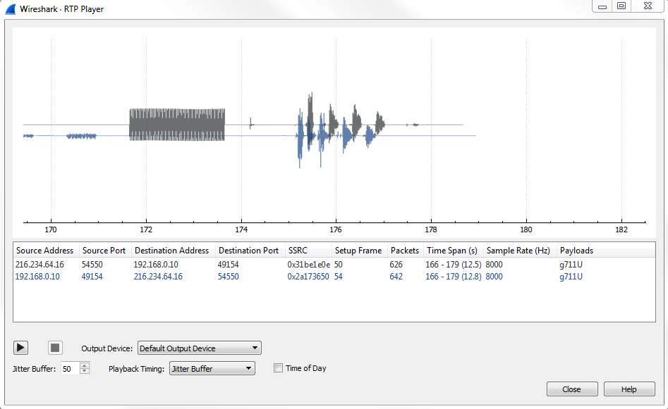 This alone may be able to tell you something about what's going on, once you get used to what certain things look like. If it's a phone that's ringing, or actual words and discussions, you might be able to pick that out just by looking at the histogram shown in the preceding screenshot. And then, of course, you can select one side or the other to bring it to your attention, so you can see what might be occurring on one of these channels or the other, whether it's the source to destination or the destination to the source from one phone to another. What we can do is, leave everything as default, and go ahead and click on the play button.