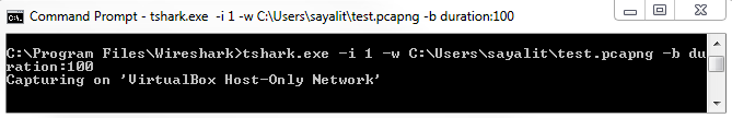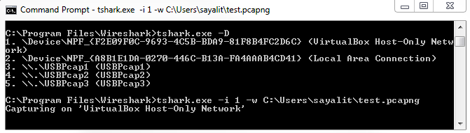 For an example, we can type tshark -D just to display all of our interfaces again. To confirm that we want to use interface number 1, we'll type tshark.exe -i 1, which ensures the use of the first interface. Then, we can define an output file as well, so we'll write this out to C:\Users\sayalit\test.pcapng, and now it begins capturing: