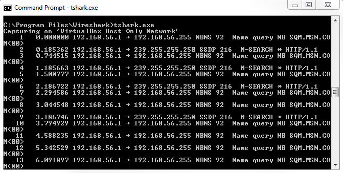 In order to run tshark, you have to open up the command window, and once it's up, we have to browse to where Wireshark is installed because as I've explained, unless you have it in your system path, it'll not be available. So we'll browse again to where Wireshark lives, and we'll do a directory listing. We'll see that we have tshark.exe. This is installed by default with Wireshark. In order to run tshark, all you have to do is, of course, run tshark.exe. If you do so, it automatically begins capturing on your default interface: