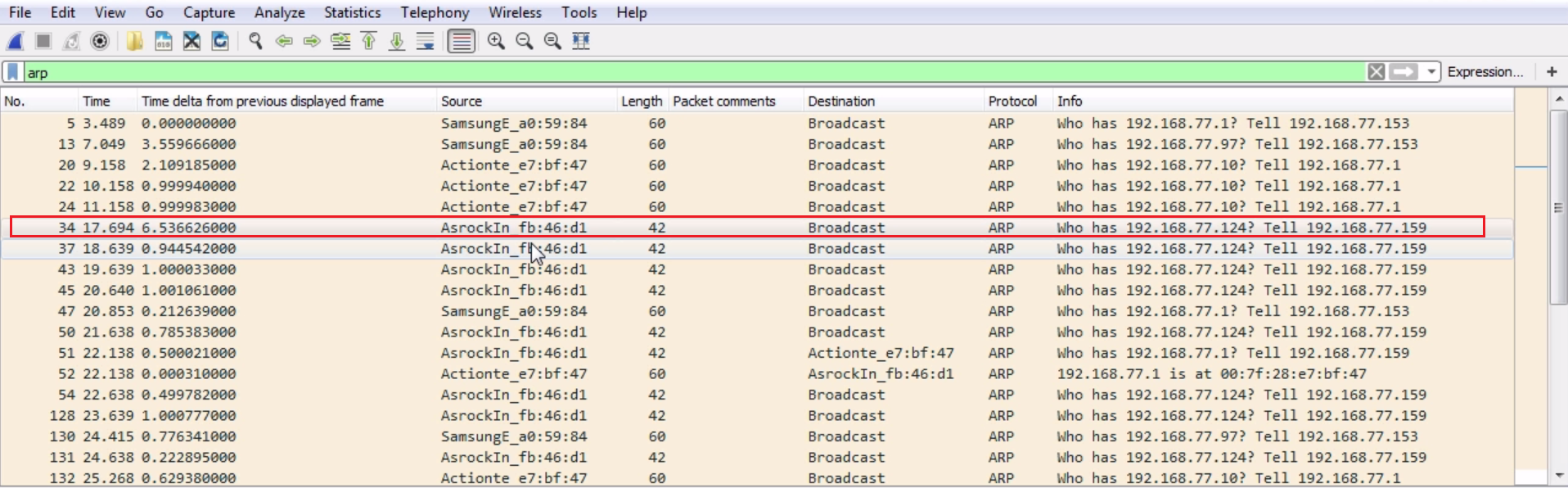 We can see the request highlighted in the preceding screenshot: Who has 192.168.77.124?
