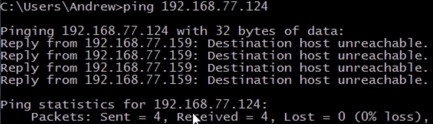 We will see Destination host unreachable show up. We will do that a couple of times. Since we are trying a ping, it's going to do that four times on a Windows system. If you're on Linux or macOS, it'll probably do that nonstop, depending on what you use.