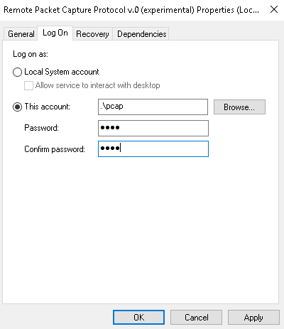 - We'll select the This account: radio option and Browse... to the pcap user, or whatever you named yours. Enter that and click on Check Names. It verifies that it's the correct spelling and it found the account.