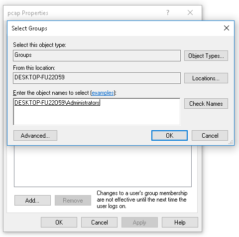 - Now that we have our pcap service account, we need to give it administrator privileges. So we do that by right-clicking on pcap. Go to Properties | Member Of | and we're going to click Add.... Type in Administrators, and go ahead and click on Check Names, which tells it to verify that the group Administrators is correctly typed in:
