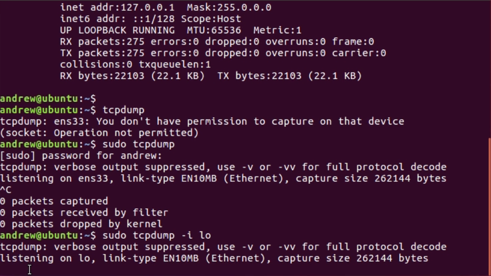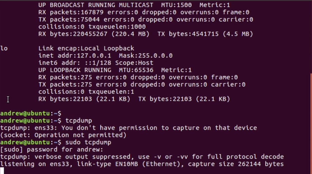 Now, this is a virtual machine that's running right now, which is why it shows ens33 as the interface name. Quite often, this is eth0 or something like that. lo is our loopback on the system. Just like every other system you've seen in Windows and such, there's usually a loopback. This is a loopback on this system. If we look back to our information, we can run tcpdump, and we can also define an interface with the -i so that's where that interface comes in. We're going to do tcpdump -i ens33. Now, by default, tcpdump without the -i command will try to run on the default interface that you have, the ens33 interface in this example, and we can take a look at that in the following screenshot. When I try to do that, you'll see that I have an error. It says that You don't have permission to capture on that device: