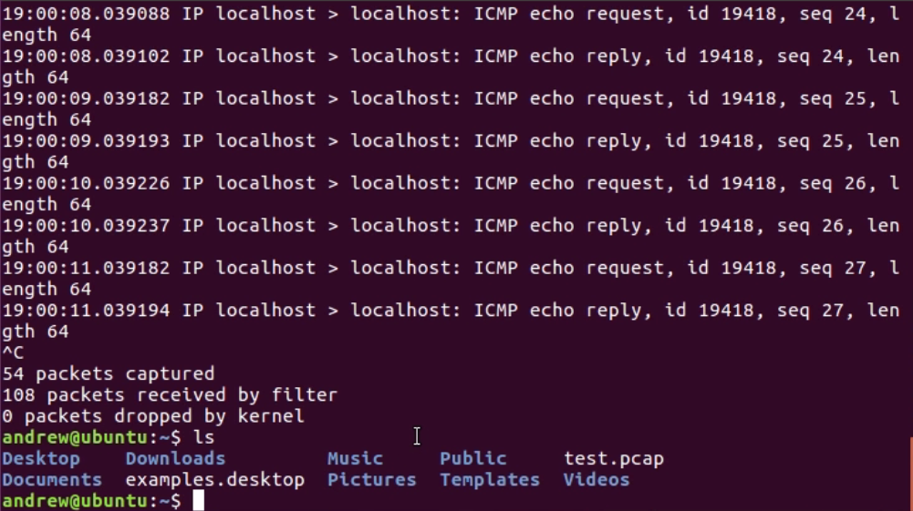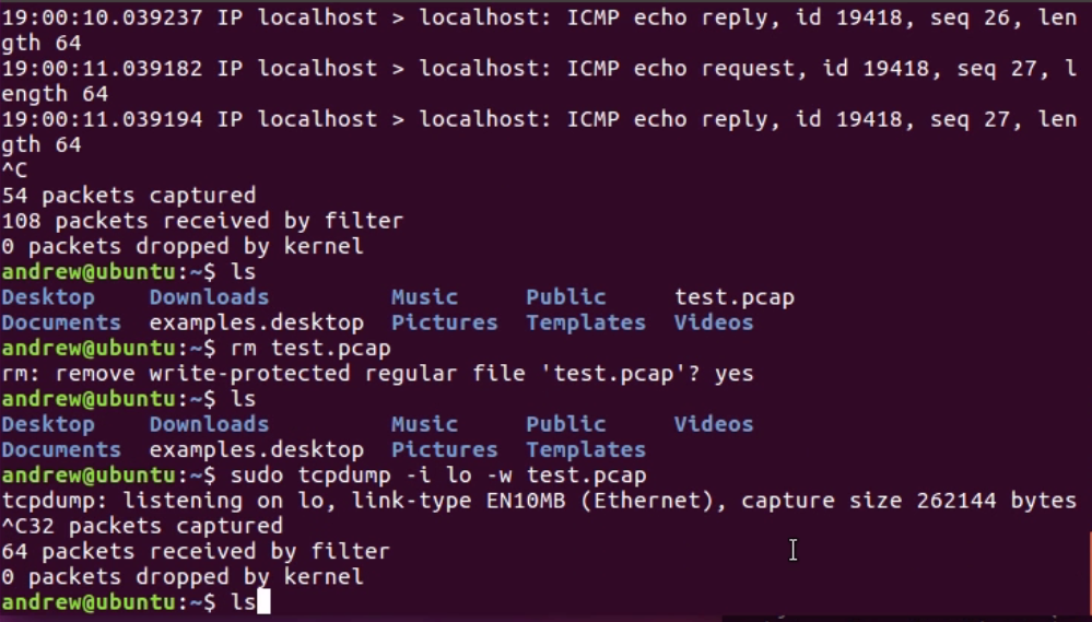 By running that, it outputs to the stdout to the Terminal, but it doesn't actually save the file. In order to do so, we would have to define the file, just like in tshark. We'll remove my previous test files by typing the command rm test.pcap; you'll be able to see that it's now gone. We'll run tcpdump again, and this time, we'll define an output file for it to save to. As with tshark, luckily, we use -w for write. So, we're writing to a file test.pcap. After typing the command sudo tcpdump -i lo -w test.pcap and starting to generate some traffic, instead of outputting to the stdout, it's outputting to the file, and I can stop my traffic. I can also stop my capture, and it says it's saved 64 packets: