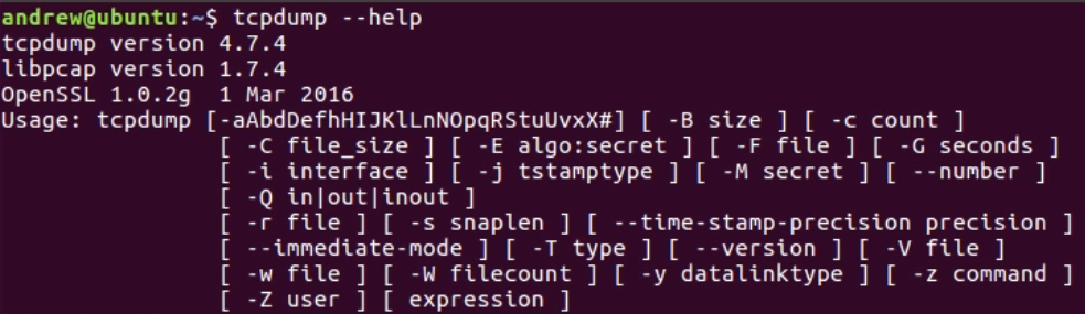 What we have is a newer version of Ubuntu, and I've opened up the Terminal window, and all you have to do is run tcpdump. It's within the system variable path, so you don't have to go browse for it like we had to for the others on Windows, and I'll run it with --help. We can see that tcpdump has displayed its help contents and it shows us what arguments are available for it to receive: