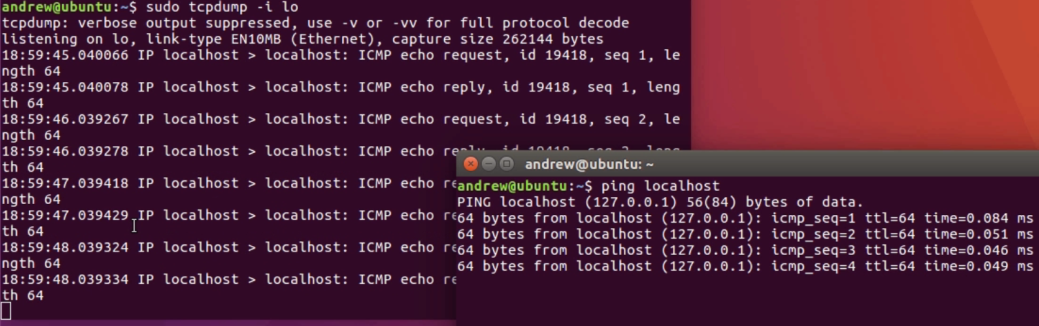 Now, we'll open up a new Terminal, and I'll generate some traffic. I'll simply ping my localhost. localhost as an alias name to 127.0.0.1, which is my loopback address. As I ping loopback, you'll now see that popping up in the tcpdump window: