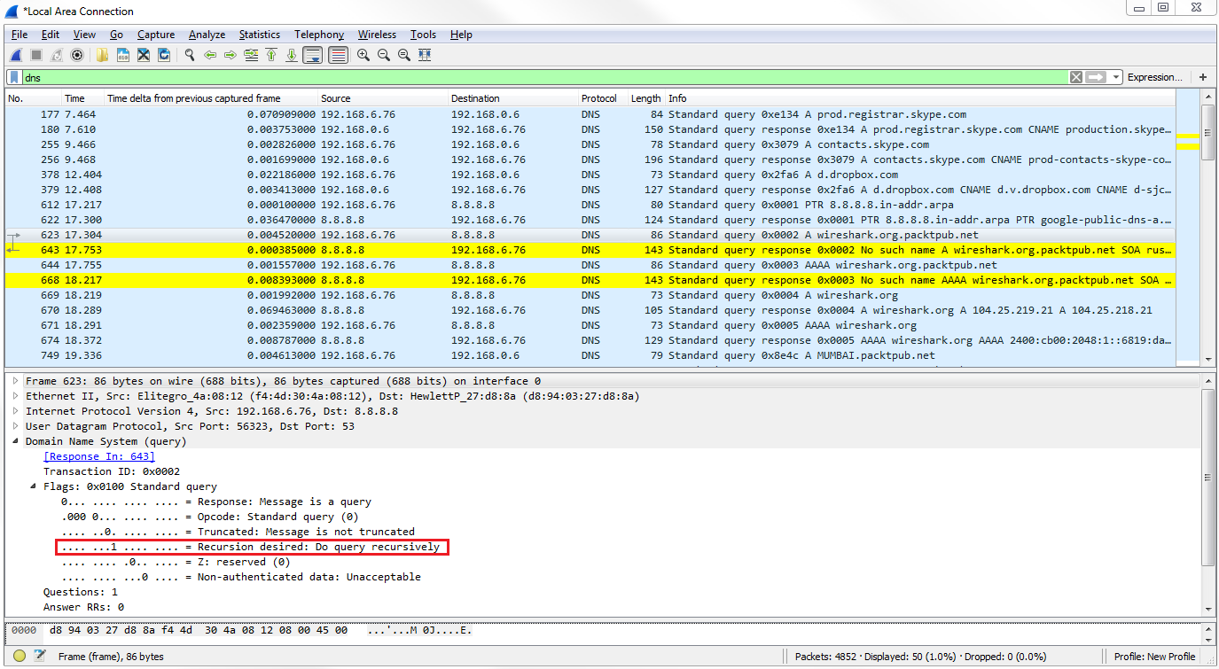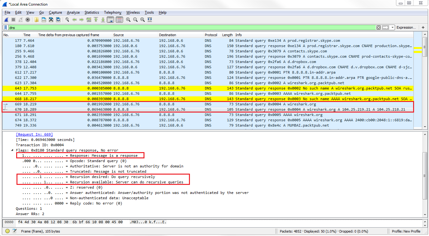 Let's go down to packet 669, where the system requests the wireshark.org A record from Google. We can see the response on packet 670. Then, we dig into the Flags, which gives the highlighted response in the following screenshot: