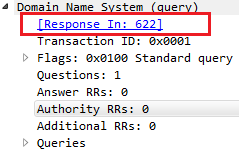 We also have a line that tells us within the DNS section of the packet details that it's a response in packet 622: