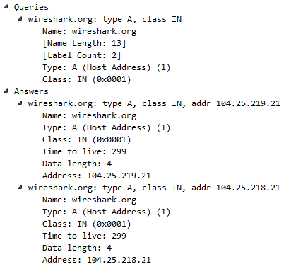 Thus, it looks like wireshark.org is using some sort of load-balancing system because we have an A record of 104.25.219.21 and 104.25.218.21. If you go to https://www.wireshark.org/, it will take you to either of these two addresses. You'll also see that there's a Time to live value, where you have a TTL of 299, which is the number of seconds that this record is to be kept on my system before it requests a new record. The TTL value is very short here, and most likely this is something to do with the fact that they are using a load balancer. If there's any sort of change in the address, it wants us to get an update as quickly as possible. It doesn't want us to keep a cached version of bad IP addresses for a very long period of time. For example, many defaults are 8 hours or 24 hours; so, converted to seconds, you might see 86,400 seconds or so.