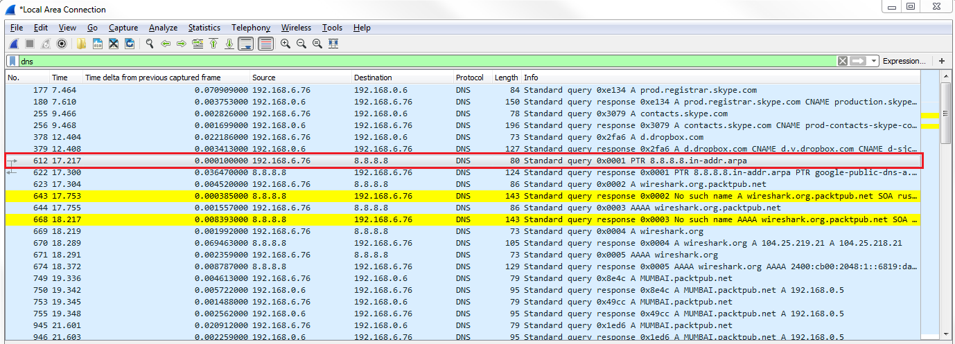 You can see the first request. So we have some other DNS requests that occurred by the system. We'll take a look at the first query highlighted in the preceding screenshot.