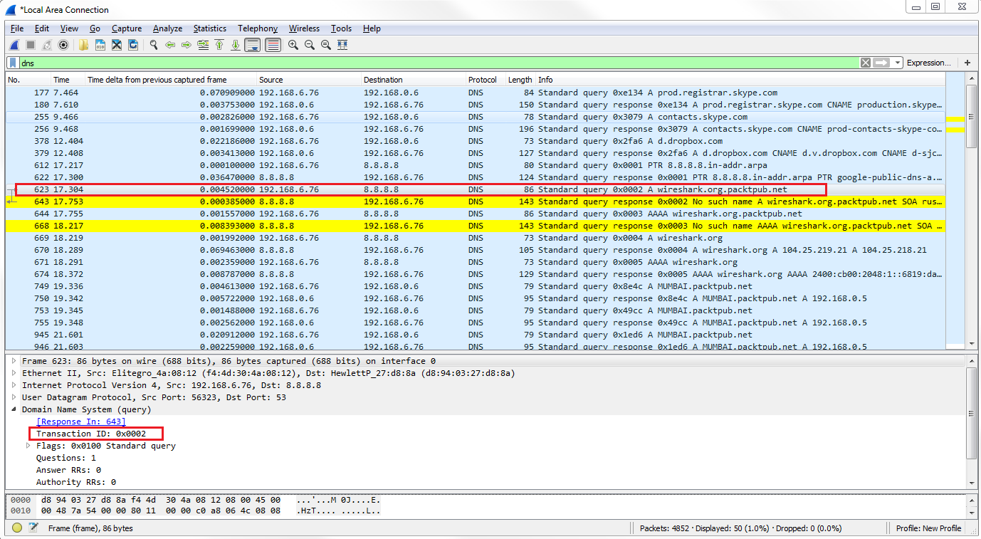 If we look at the packets in response to the query, they will have a matching transaction ID.