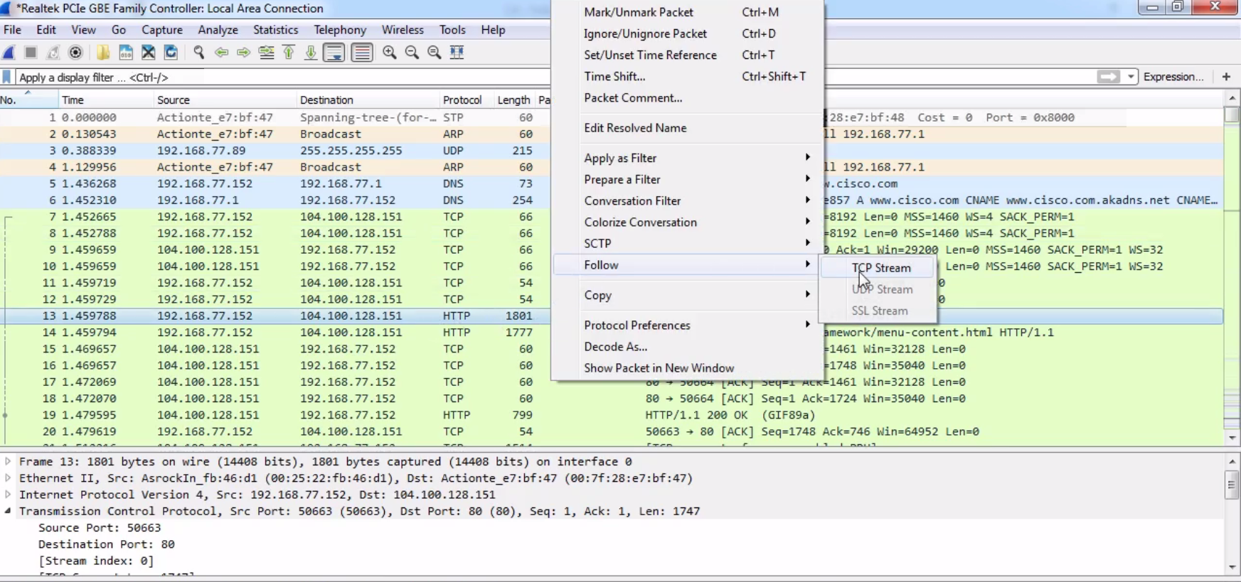 So, how can we pick out individual communications within this packet capture? Because one thing you'll note is, in a web page, you have multiple files, graphics, CSS files, JavaScript, or whatever it might be that it needs to retrieve. There are a number of different files it has to pull in order to build the web page that you see. Each one of these is its own communication and its own TCP stream. So, what we need to do to follow a TCP or UDP stream is to select a packet within the capture that is within the stream that we wish to view. So, for each of these individual files in this web page, each one's going to be its own TCP stream. So we need to select a packet within that, and then follow the stream.