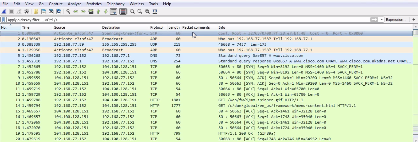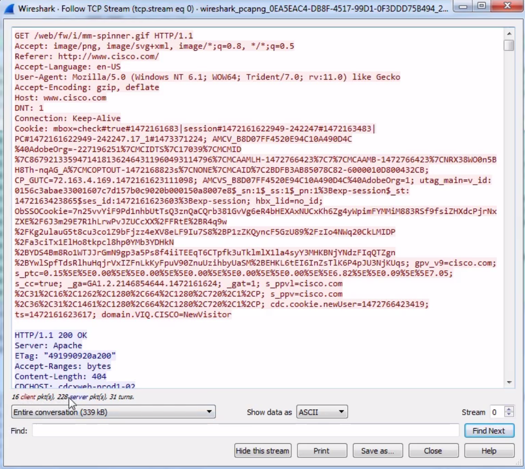 In the previous section, we went over how to use display filters to limit what you see in a packet capture. In this section, we'll build on that and follow streams. What that means is, in this section, we'll follow TCP and UDP streams to pick out conversations within our packet capture so that we can view the specific communications between each TCP communication or each UDP communication. So, what we have is a packet capture of opening up the https://www.cisco.com/ home page. And the https://www.cisco.com/ home page is not encrypted with SSL by default, so we can see all of the HTTP communications within it without having to add in some sort of SSL key to decrypt it: