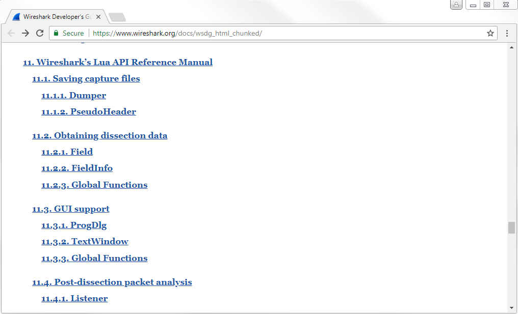 You can see it gives you an entire write-up on how dissection works within Wireshark and how you can expand upon it with Lua in order to create your own dissectors. Additionally, if you go back and go down to Section 11, you can see that there is the entire Wireshark Lua API Reference Manual: