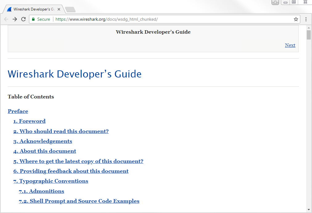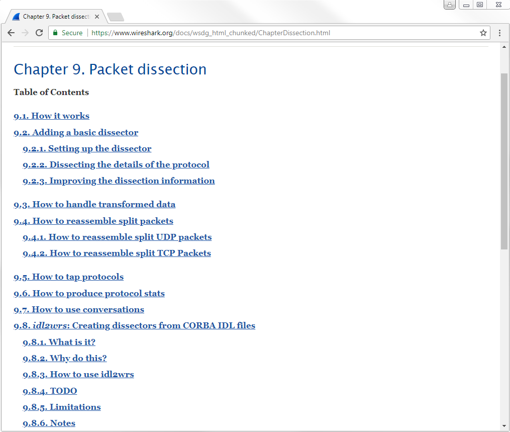 In the Wireshark developer's guide, scroll down to the correct section. You'll see under Wireshark Development we have Packet dissection. Let's click on it and see what we get: