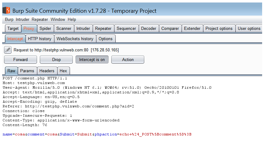 In this request, we have four parameters: name, comment, Submit, and phpaction. It is important to remember that not only do the parameters used as fields in a form need to be considered as parameters, but all the parameters in a request are equally important, because sometimes developers use these hidden parameters as control variables to manage website functionality. And as these parameters do not have user interaction theoretically; they are more likely to be vulnerable.